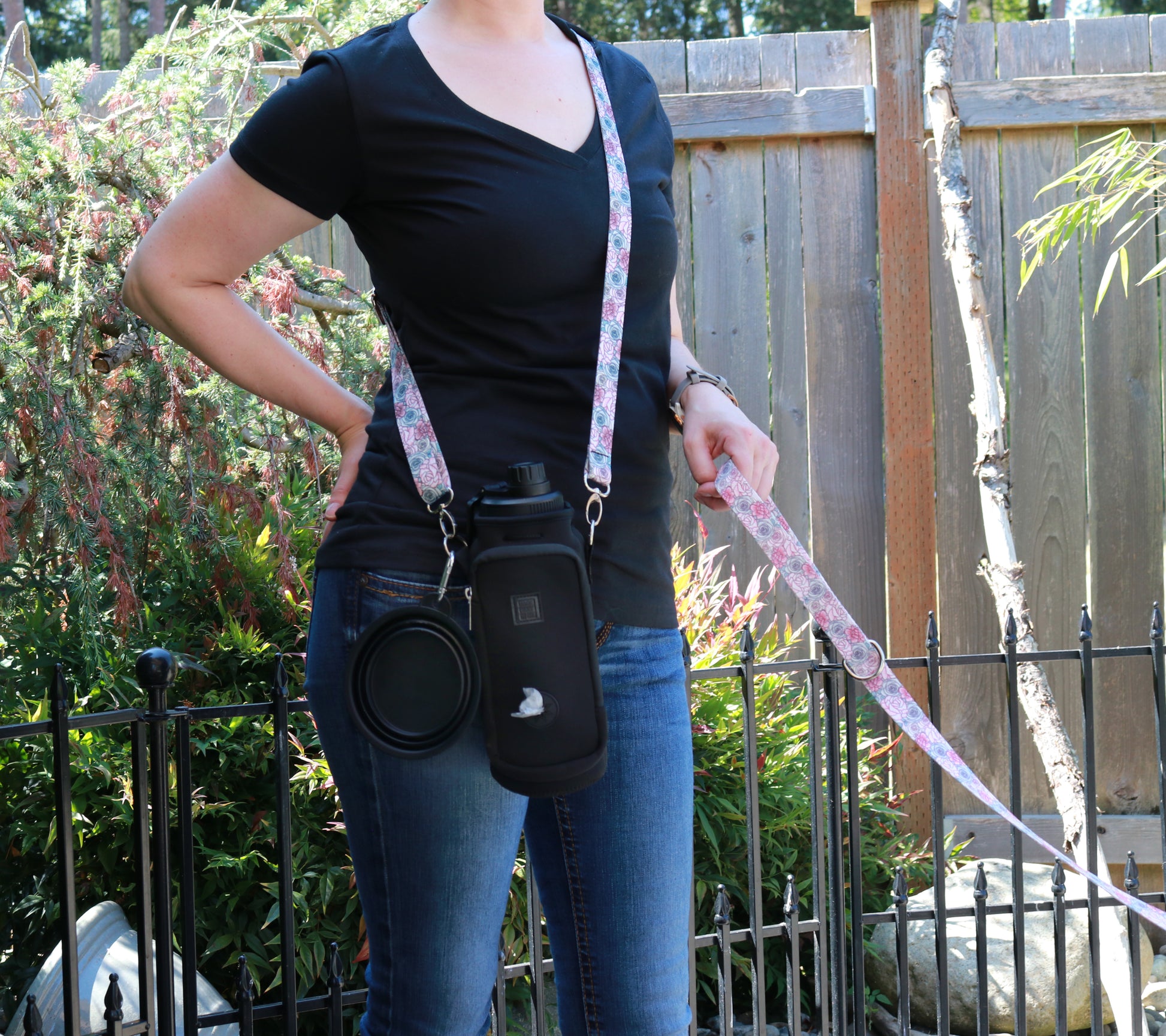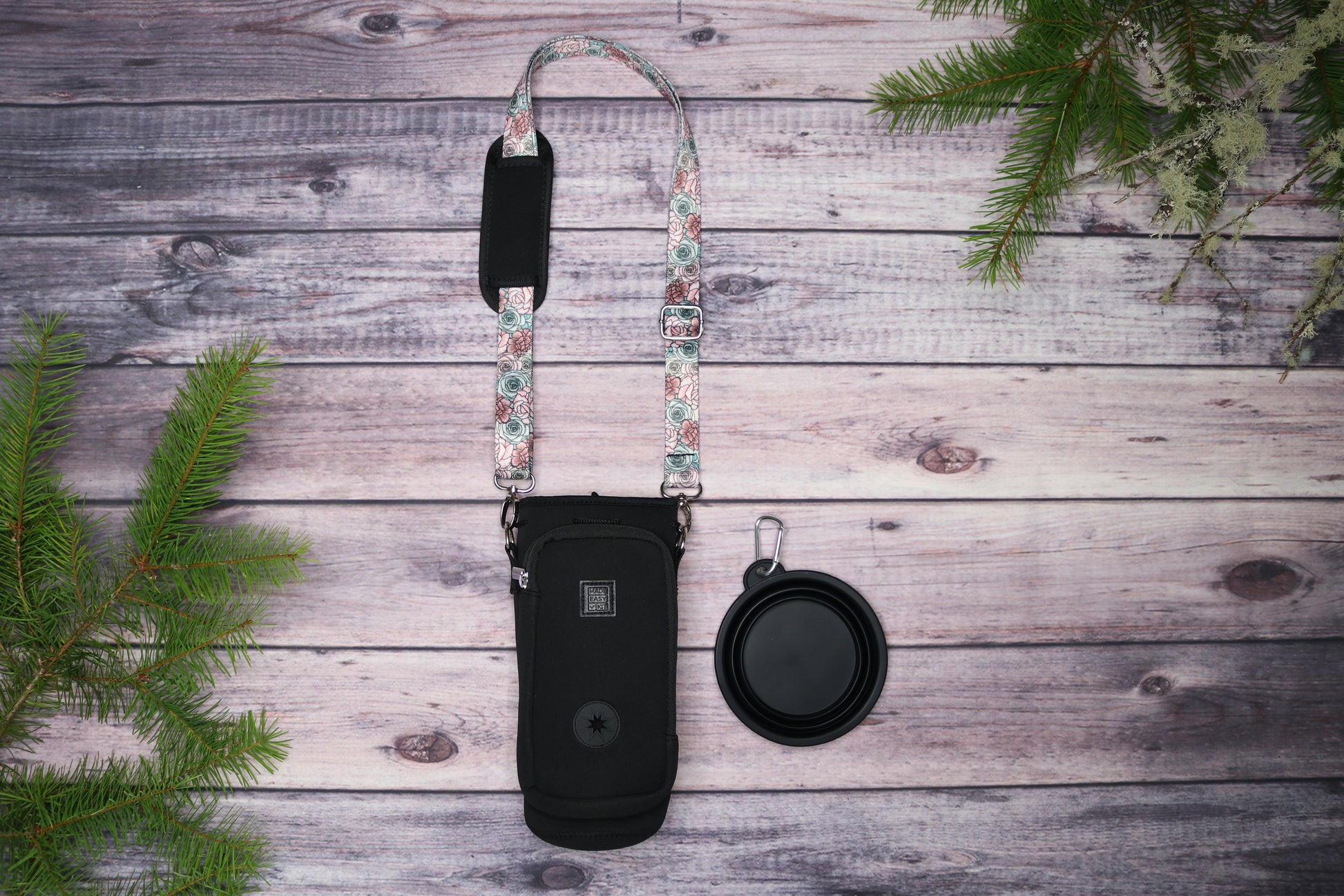 This premium crossbody water bottle holder is crafted with durable triple stitching and all-metal hardware for lasting use. Choose from two sizes: Small will hold up to 32oz water bottles and Large will hold up to 40oz water bottle containers. Both sizes have a shoulder strap that can adjust up to 55". It features a built-in dog poop waste bag dispenser, and the small size contains enough space to hold keys and a debit card simultaneously while the Large size can contain larger cell phones as well. Comfortable to carry over the shoulder, it’s ideal for walks, hikes, or any dog adventure. The included collapsible pet bowl adds convenience on the go. A practical and thoughtful gift for pet owners, this accessory combines functionality with expert design (bottle not included).