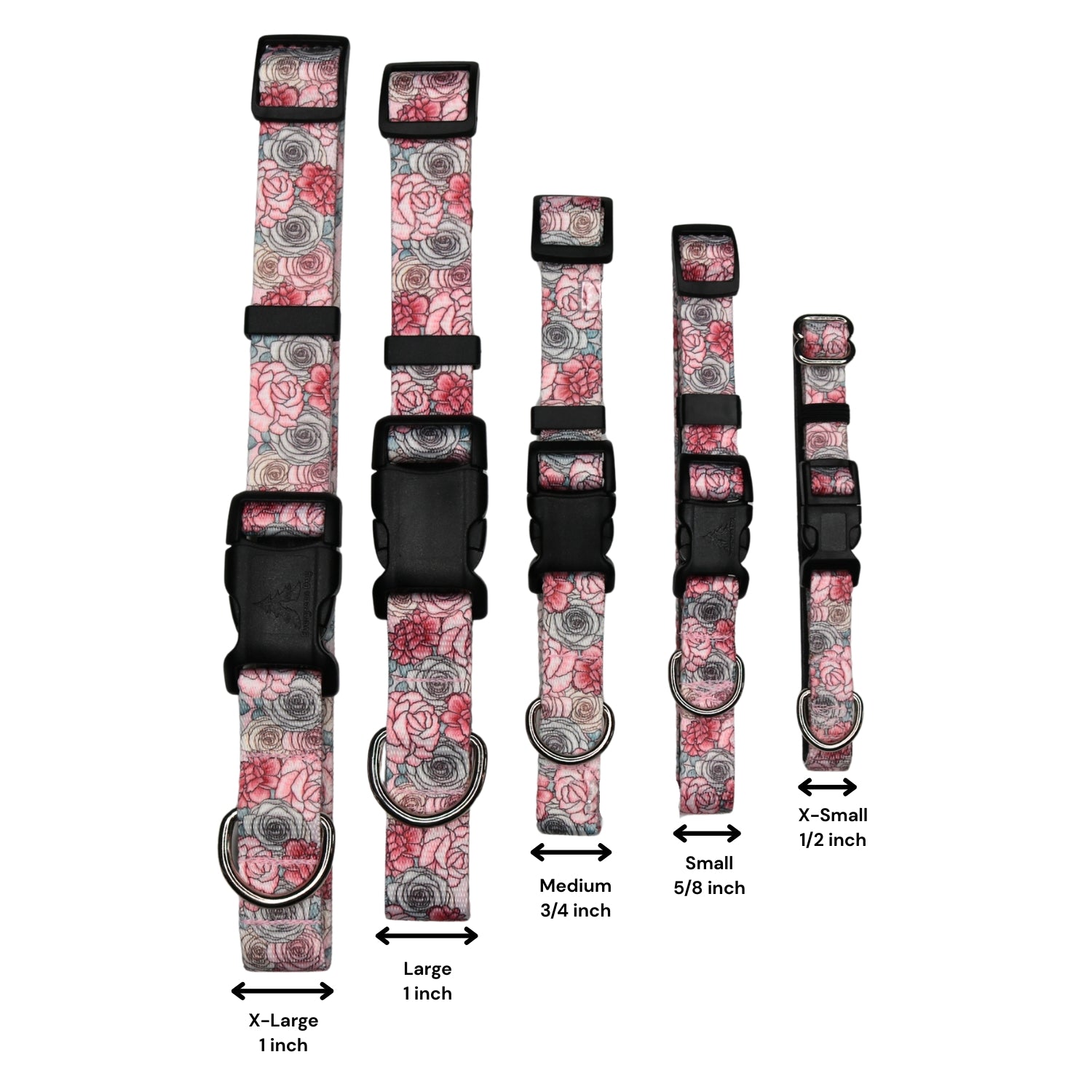 Crafted from materials designed for mountain climbing, our collars offer exceptional strength and durability. The Blooming Elegance Collars come in sizes from X-Small to X-Large, see the sizing chart for your dog's recommended collar size. Made from 100% polyester, it is fully machine washable and maintains its vibrant colors without fading. This collar combines expert-level toughness with easy maintenance, ensuring reliable daily use.