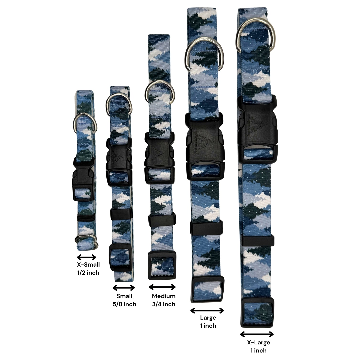 Crafted from materials designed for mountain climbing, our collars offer exceptional strength and durability. The Blue Camo Trees Collars come in sizes from X-Small to X-Large, see the sizing chart for your dog's recommended collar size. Made from 100% polyester, it is fully machine washable and maintains its vibrant colors without fading. This collar combines expert-level toughness with easy maintenance, ensuring reliable daily use.