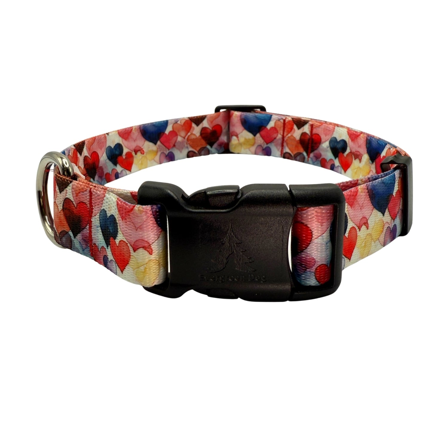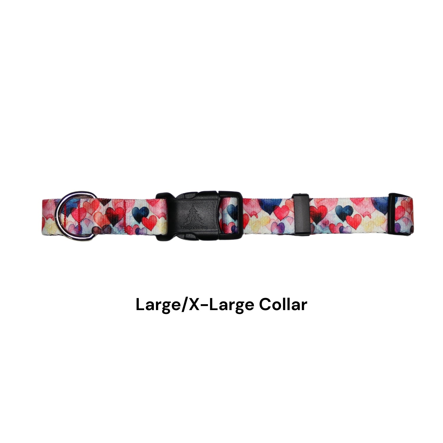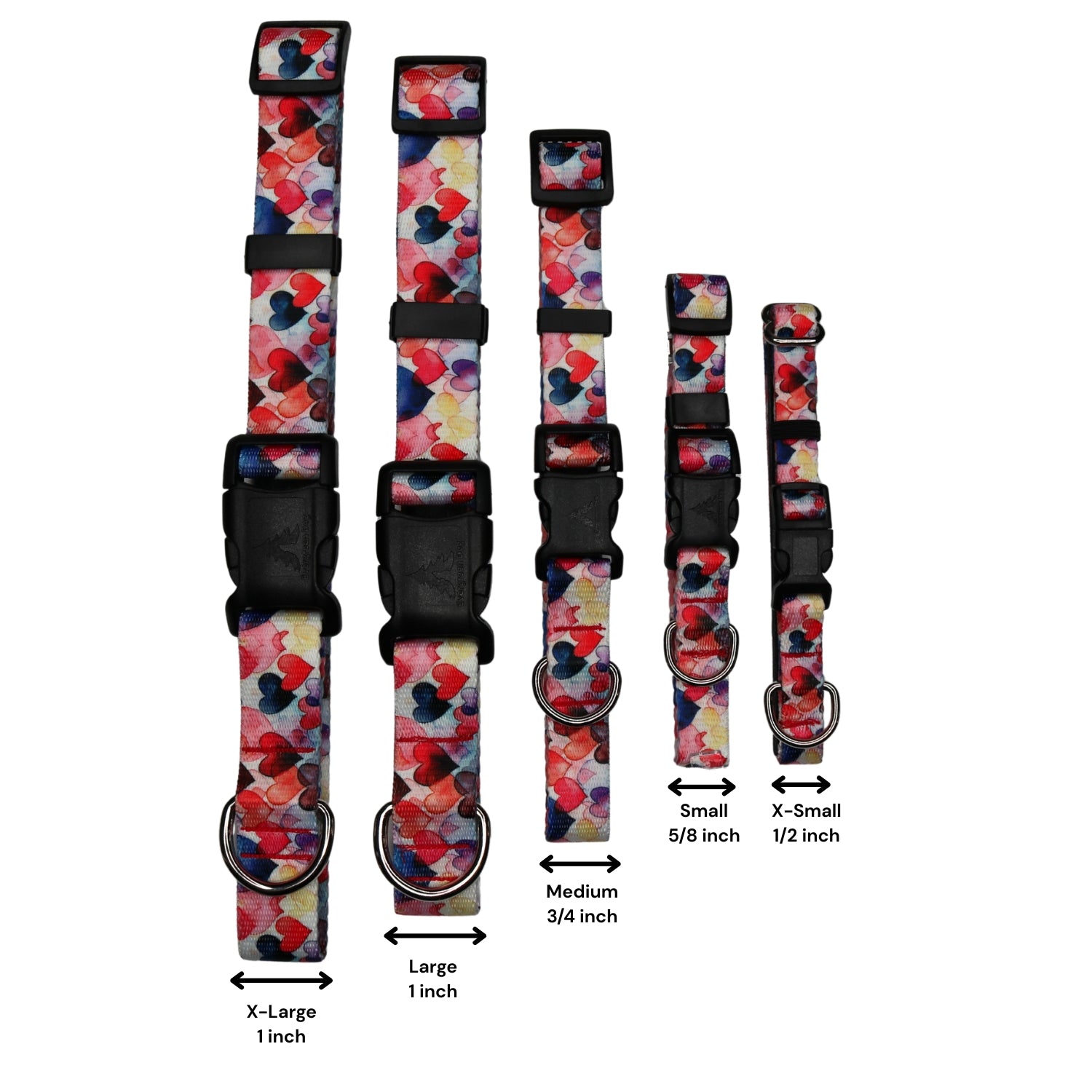 Crafted from materials designed for mountain climbing, our collars offer exceptional strength and durability. The Dancing Hearts Collars come in sizes from X-Small to X-Large, see the sizing chart for your dog's recommended collar size. Made from 100% polyester, it is fully machine washable and maintains its vibrant colors without fading. This collar combines expert-level toughness with easy maintenance, ensuring reliable daily use.