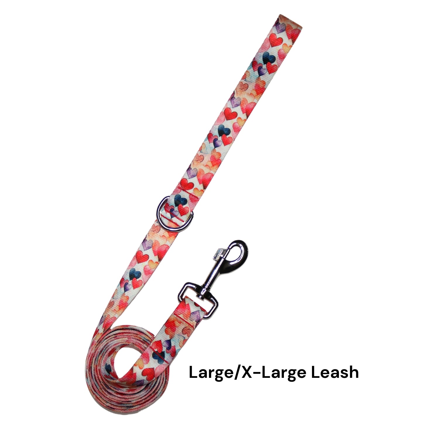 Crafted from materials designed for mountain climbing our leash offers exceptional strength and durability. The Dancing Hearts Leash comes in 4 sizes from X-Small to Large/X-Large. Each leash is standard 6 feet long. Made from 100% polyester, it is fully machine washable and maintains its vibrant colors without fading. This leash combines expert-level toughness with easy maintenance, ensuring reliable performance on every walk.