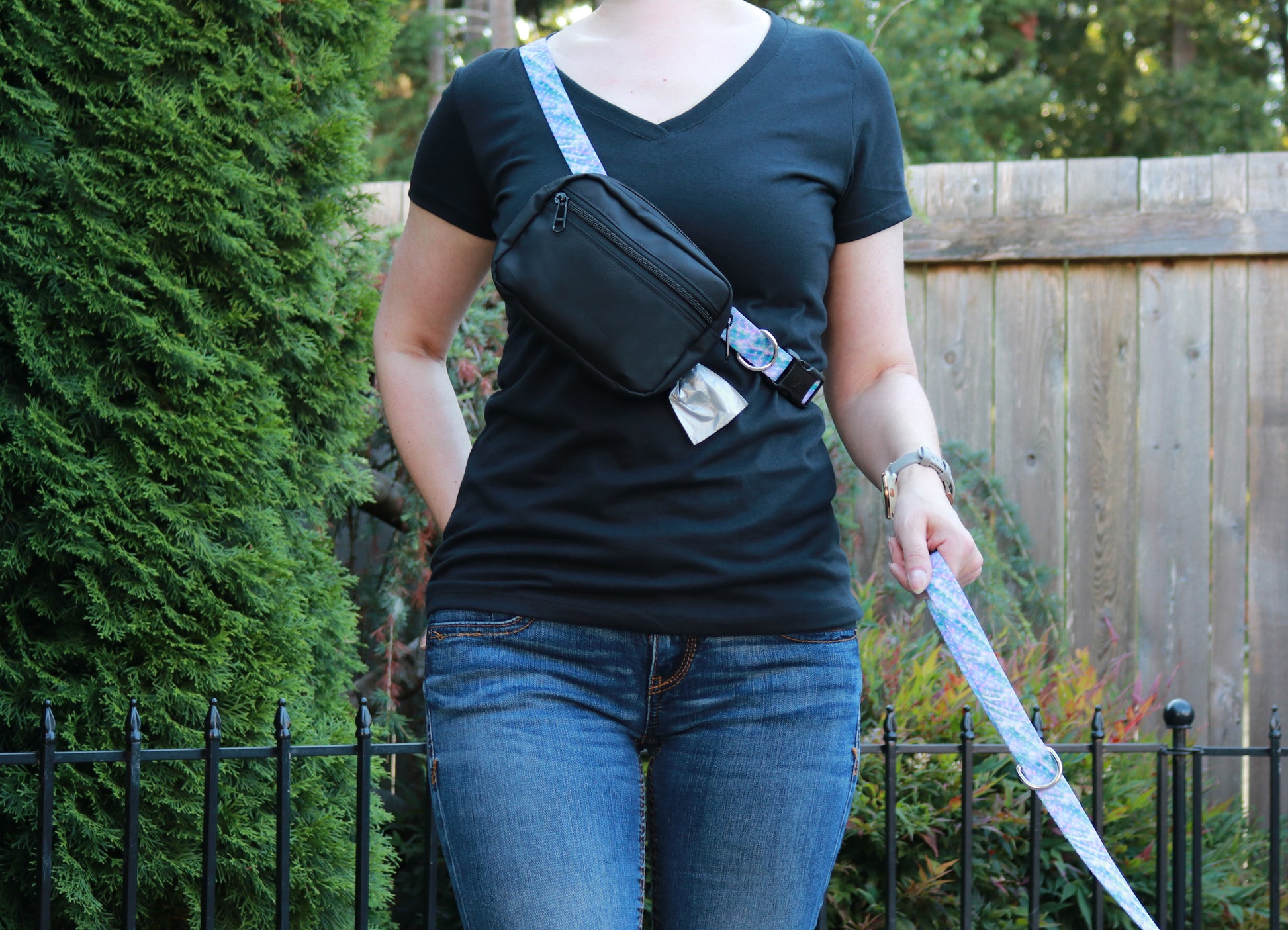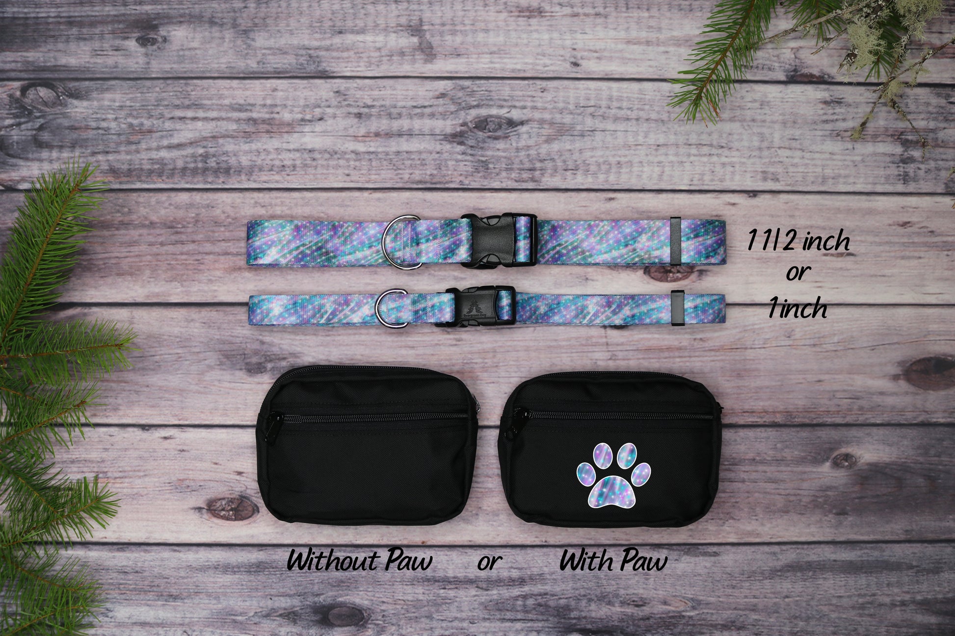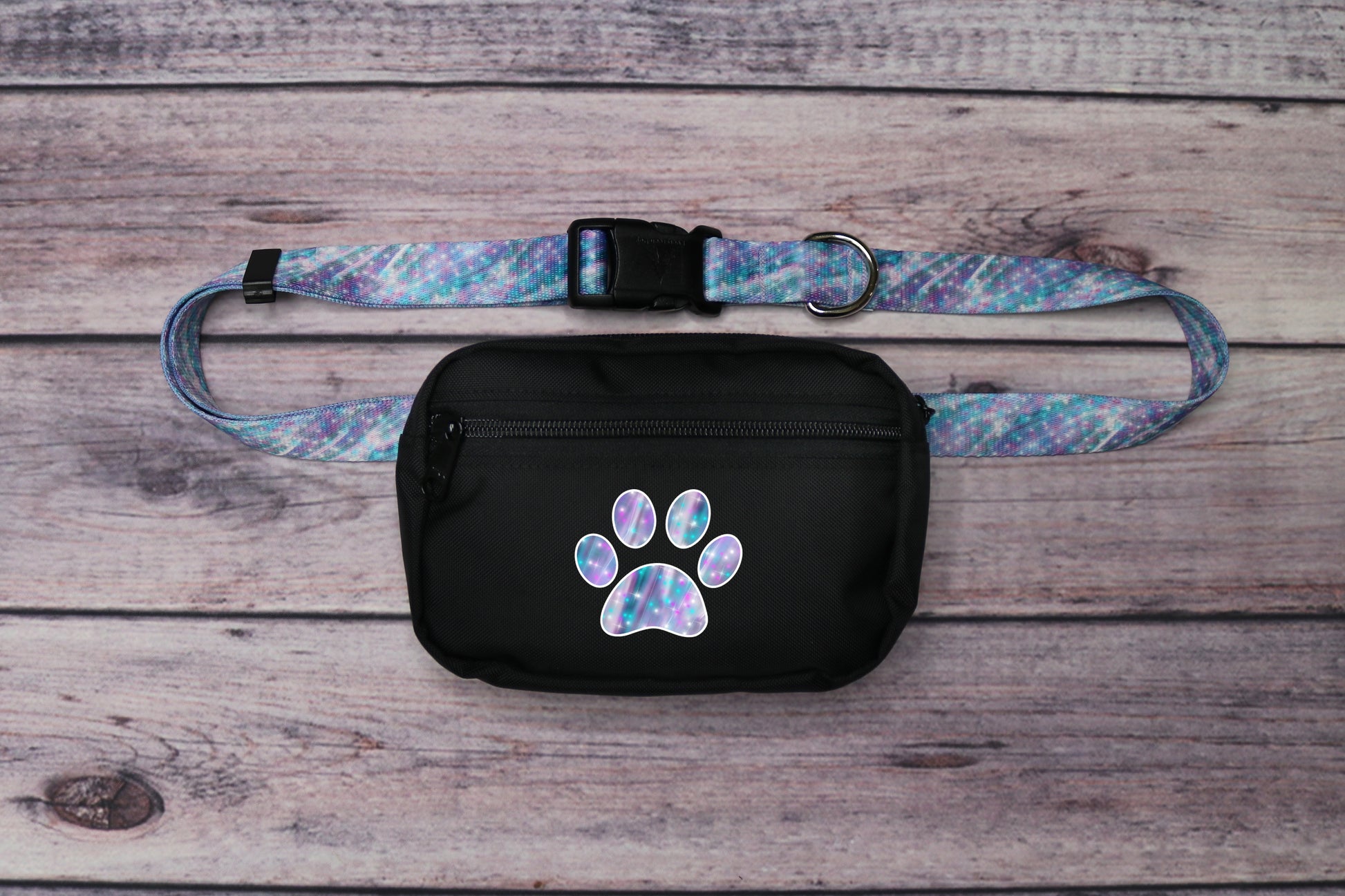 Keep all your and your dog's essentials organized with the Pastel Storm Fanny Pack. Featuring a roomy main compartment for your items and a front pouch ideal for dog treats, this pack also includes a discreet bag dispenser on the back with an internal zipper pocket that holds two rolls, ensuring you're always prepared. Measuring 5" x 7", it is crafted from 50% recycled, durable materials. Choose between a 1.5-inch or 1-inch strap for a comfortable fit, with the 1.5-inch recommended for larger dogs and the 1-inch for smaller breeds. Each pack comes with a carabiner clip for the option to go handsfree and an optional free paw decoration.