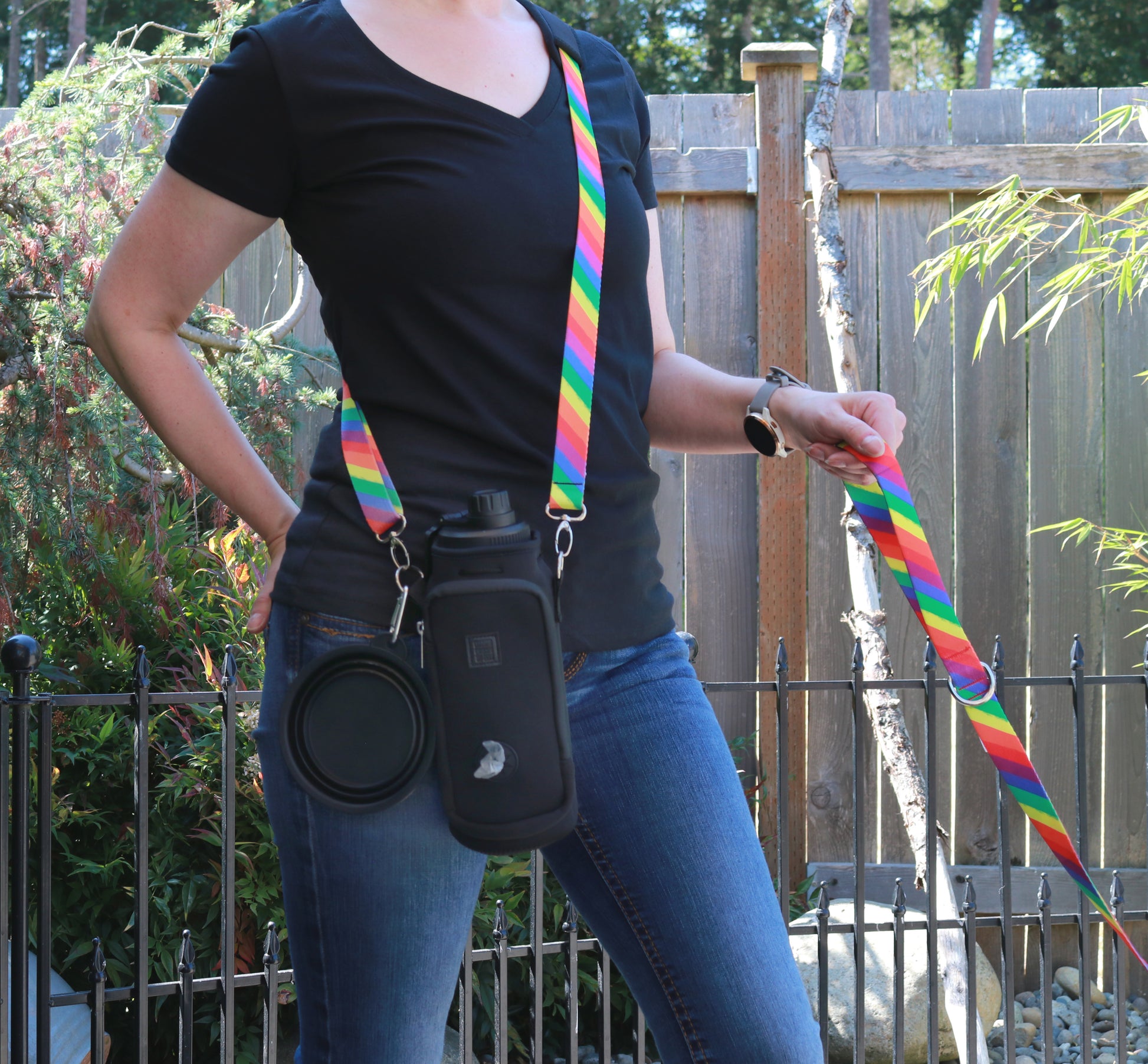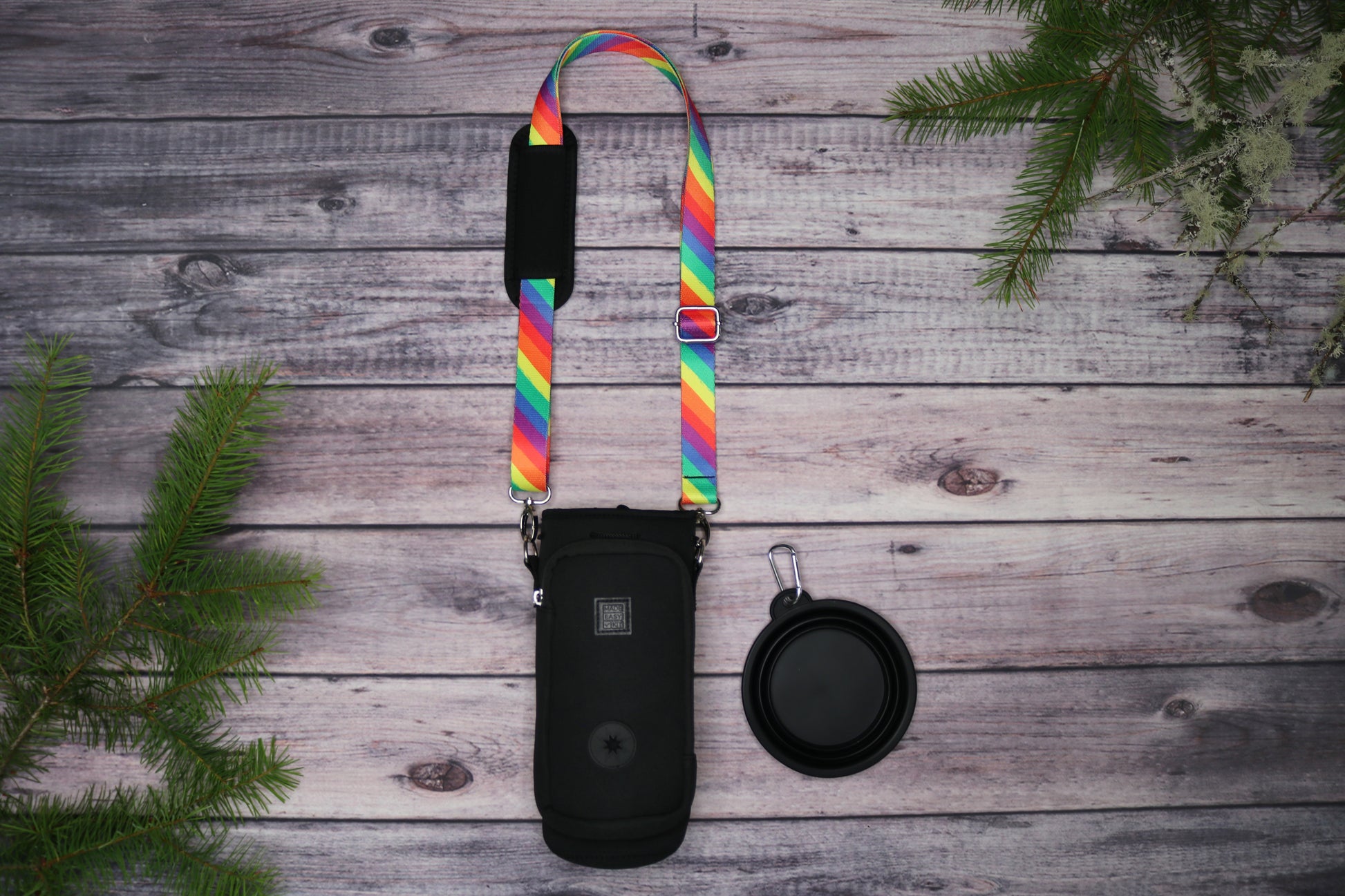This Pride Rainbow premium crossbody water bottle holder is crafted with durable triple stitching and all-metal hardware for lasting use. Choose from two sizes: Small will hold up to 32oz water bottles and Large will hold up to 40oz water bottle containers. Both sizes have a shoulder strap that can adjust up to 55". It features a built-in dog poop waste bag dispenser, and the small size contains enough space to hold keys and a debit card simultaneously while the Large size can contain larger cell phones as well. Comfortable to carry over the shoulder, it’s ideal for walks, hikes, or any dog adventure. The included collapsible pet bowl adds convenience on the go. A practical and thoughtful gift for pet owners, this accessory combines functionality with expert design (bottle not included).