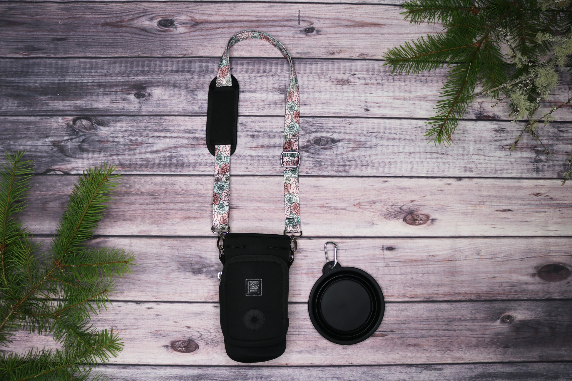 This premium crossbody water bottle holder is crafted with durable triple stitching and all-metal hardware for lasting use. Choose from two sizes: Small will hold up to 32oz water bottles and Large will hold up to 40oz water bottle containers. Both sizes have a shoulder strap that can adjust up to 55". It features a built-in dog poop waste bag dispenser, and the small size contains enough space to hold keys and a debit card simultaneously while the Large size can contain larger cell phones as well. Comfortable to carry over the shoulder, it’s ideal for walks, hikes, or any dog adventure. The included collapsible pet bowl adds convenience on the go. A practical and thoughtful gift for pet owners, this accessory combines functionality with expert design (bottle not included).