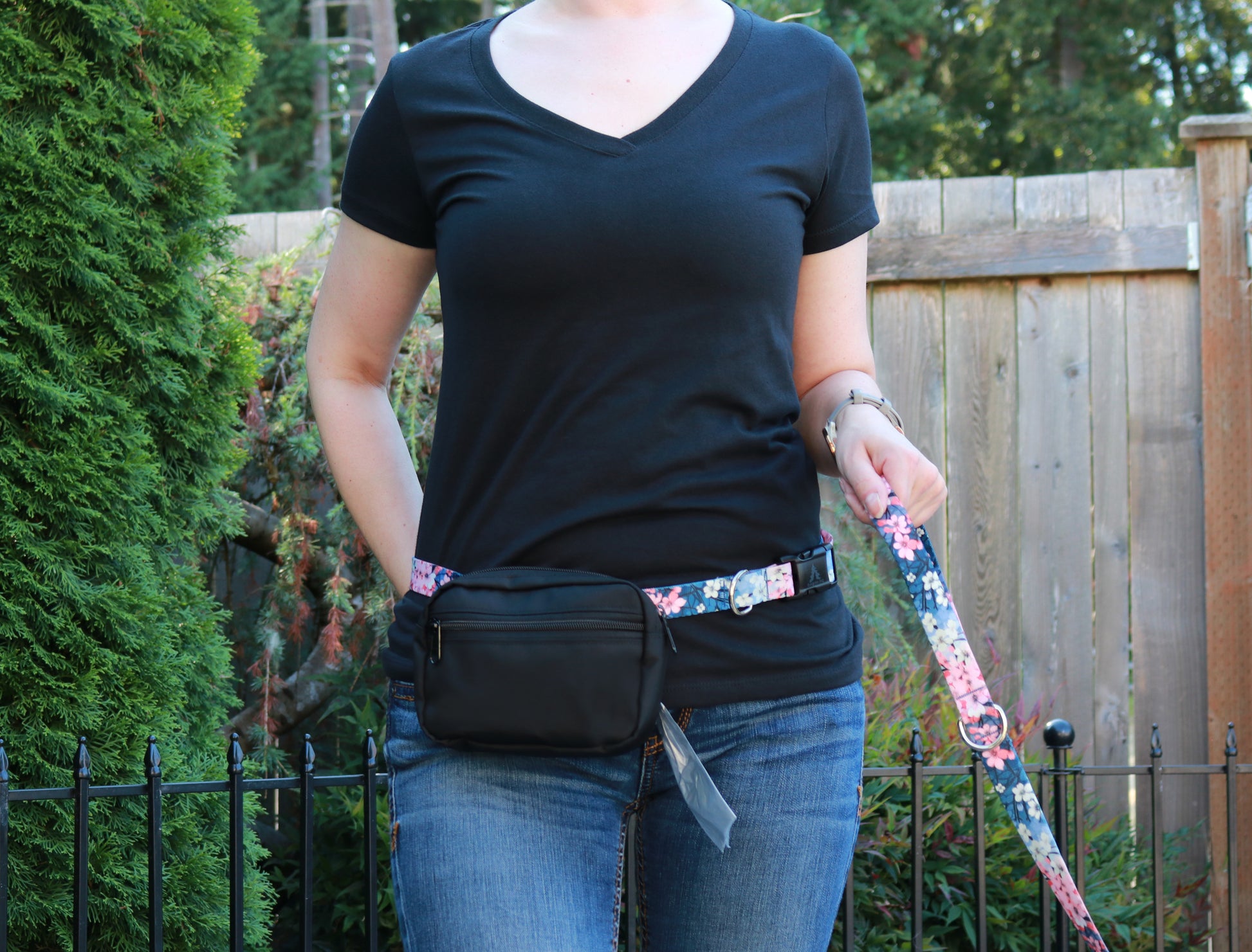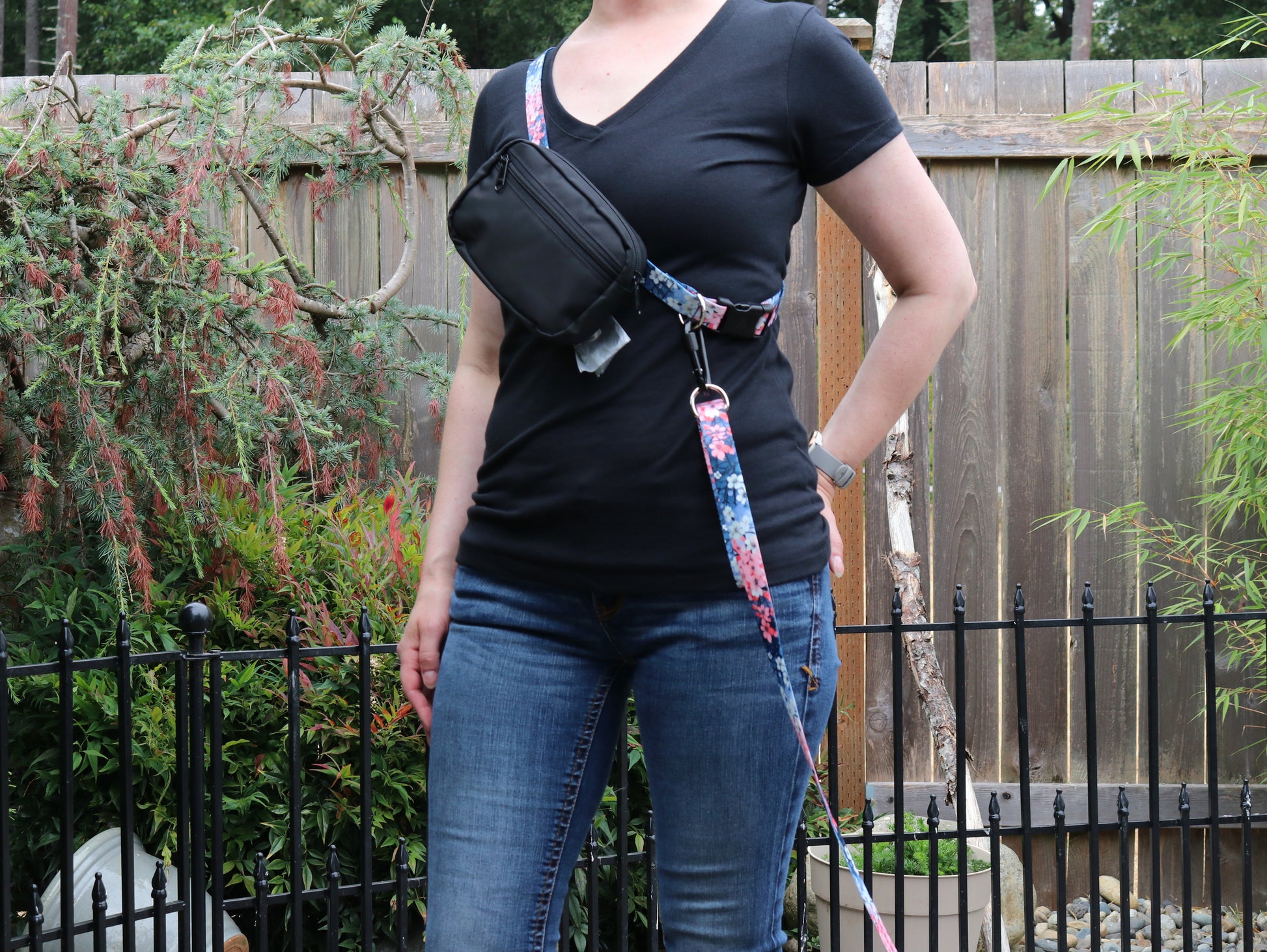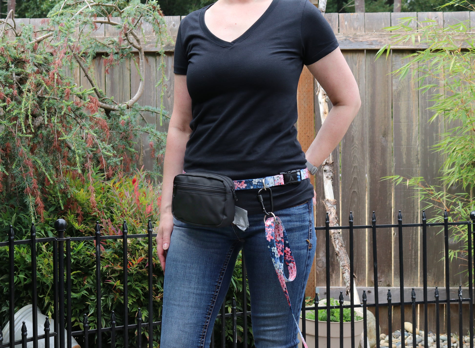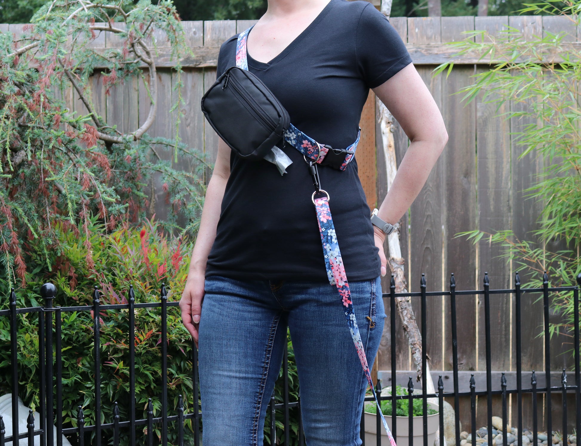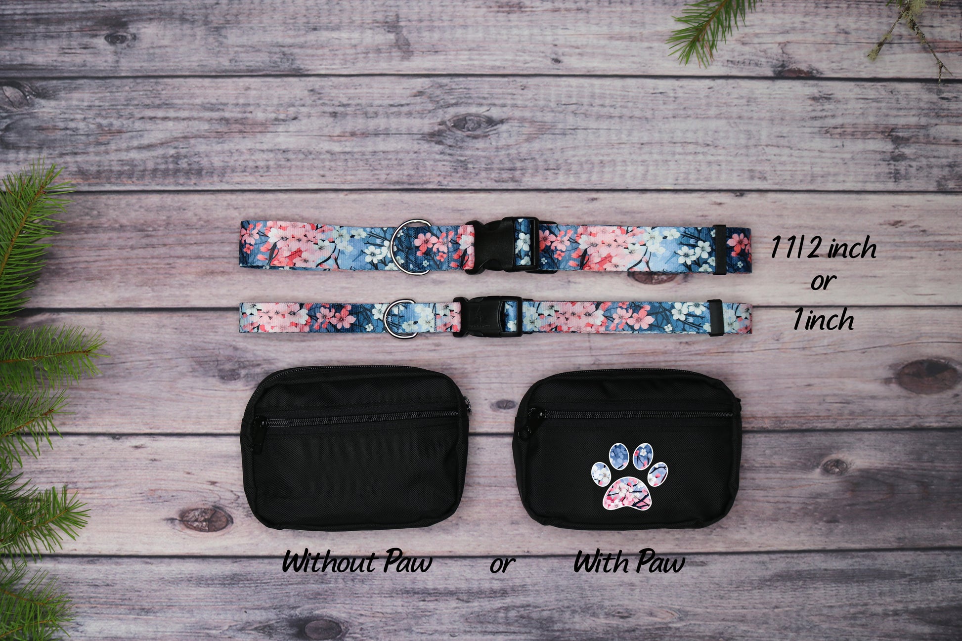 Keep all your and your dog's essentials organized with the Cherry Blossom Dreams Fanny Pack. Featuring a roomy main compartment for your items and a front pouch ideal for dog treats, this pack also includes a discreet bag dispenser on the back with an internal zipper pocket that holds two rolls, ensuring you're always prepared. Measuring 5" x 7", it is crafted from 50% recycled, durable materials. Choose between a 1.5-inch or 1-inch strap for a comfortable fit, with the 1.5-inch recommended for larger dogs and the 1-inch for smaller breeds. Each pack comes with a carabiner clip for the option to go handsfree and an optional free paw decoration.