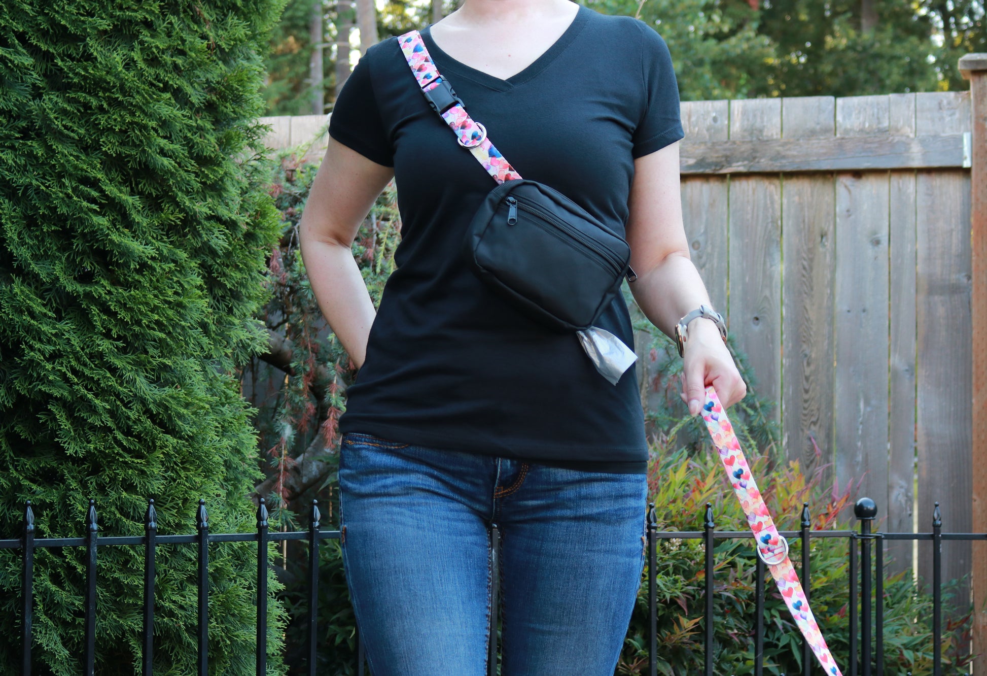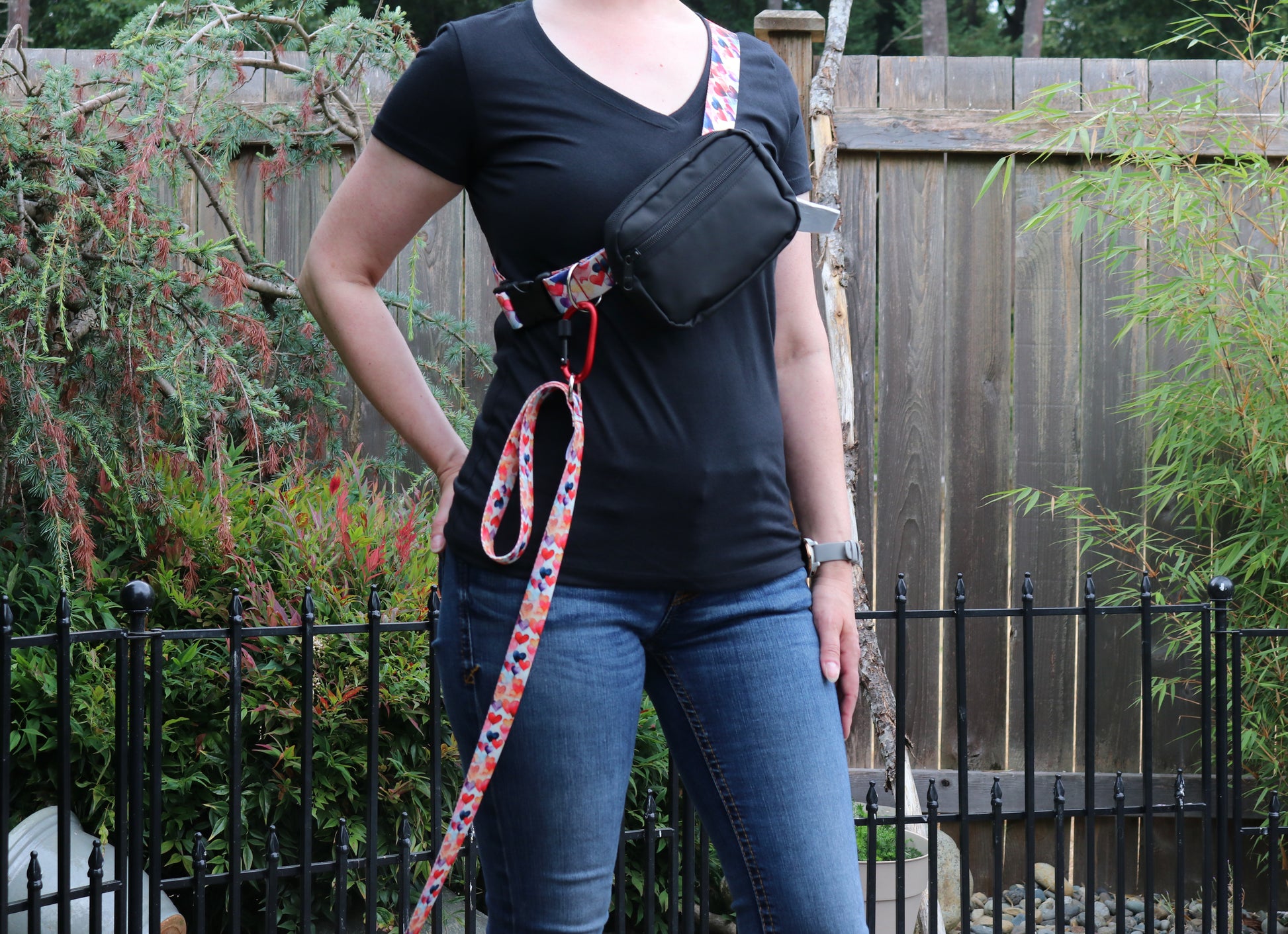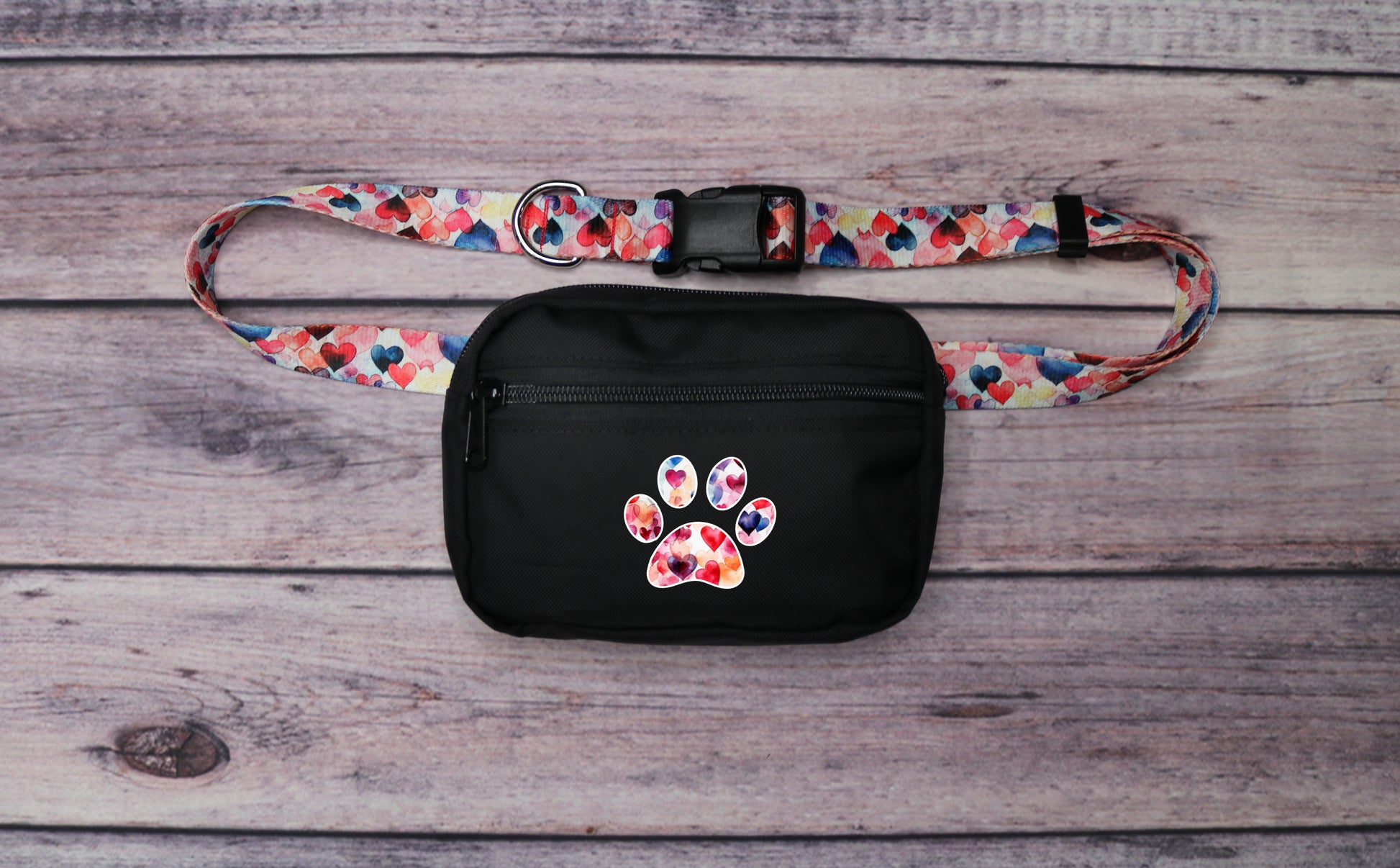Keep all your and your dog's essentials organized with the Dancing Hearts Fanny Pack. Featuring a roomy main compartment for your items and a front pouch ideal for dog treats, this pack also includes a discreet bag dispenser on the back with an internal zipper pocket that holds two rolls, ensuring you're always prepared. Measuring 5" x 7", it is crafted from 50% recycled, durable materials. Choose between a 1.5-inch or 1-inch strap for a comfortable fit, with the 1.5-inch recommended for larger dogs and the 1-inch for smaller breeds. Each pack comes with a carabiner clip for the option to go handsfree and an optional free paw decoration.