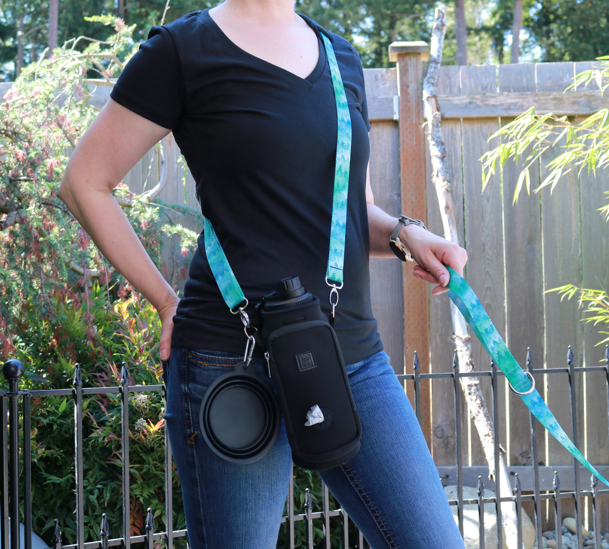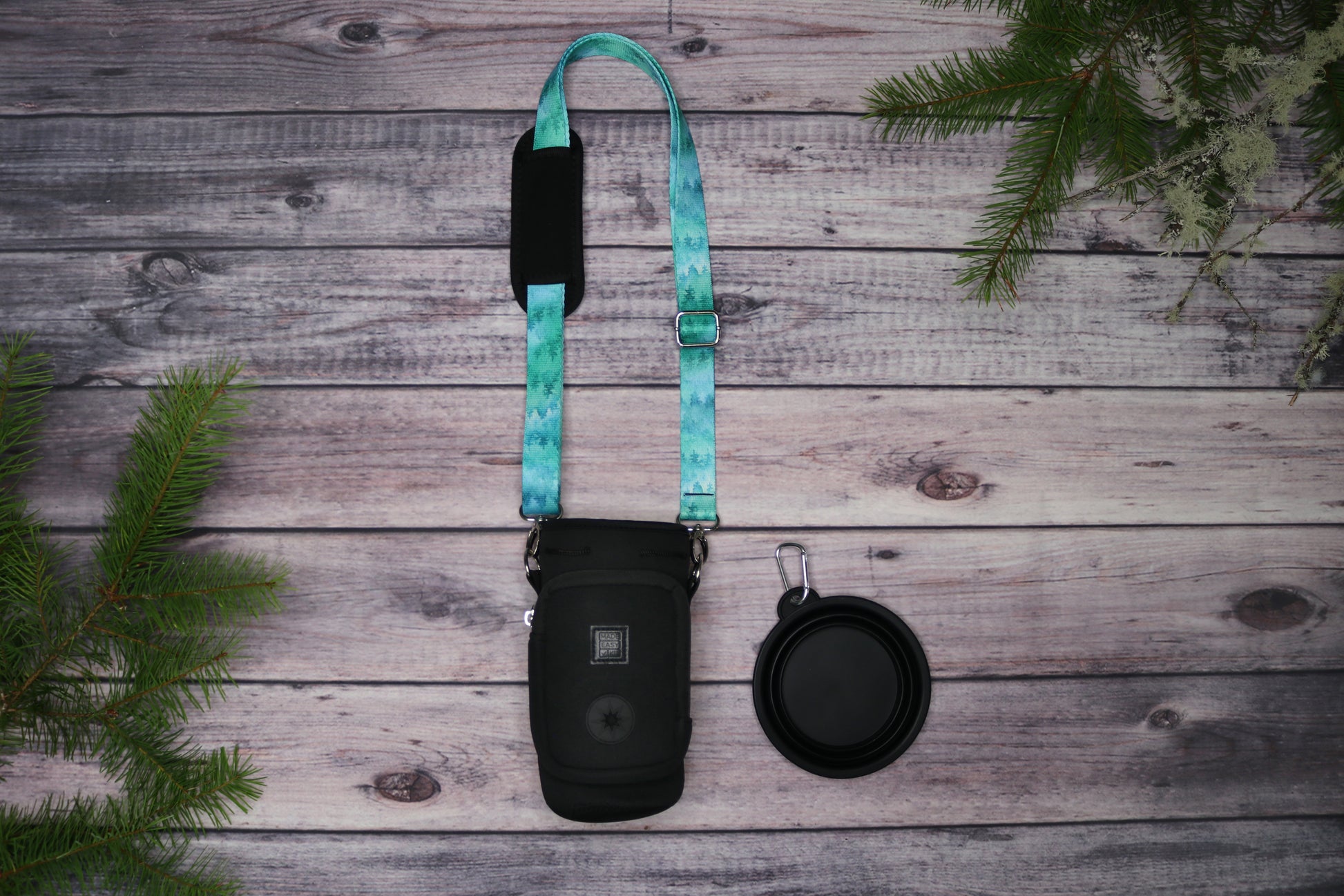 This Foggy Morning premium crossbody water bottle holder is crafted with durable triple stitching and all-metal hardware for lasting use. Choose from two sizes: Small will hold up to 32oz water bottles and Large will hold up to 40oz water bottle containers. Both sizes have a shoulder strap that can adjust up to 55". It features a built-in dog poop waste bag dispenser, and the small size contains enough space to hold keys and a debit card simultaneously while the Large size can contain larger cell phones as well. Comfortable to carry over the shoulder, it’s ideal for walks, hikes, or any dog adventure. The included collapsible pet bowl adds convenience on the go. A practical and thoughtful gift for pet owners, this accessory combines functionality with expert design (bottle not included).