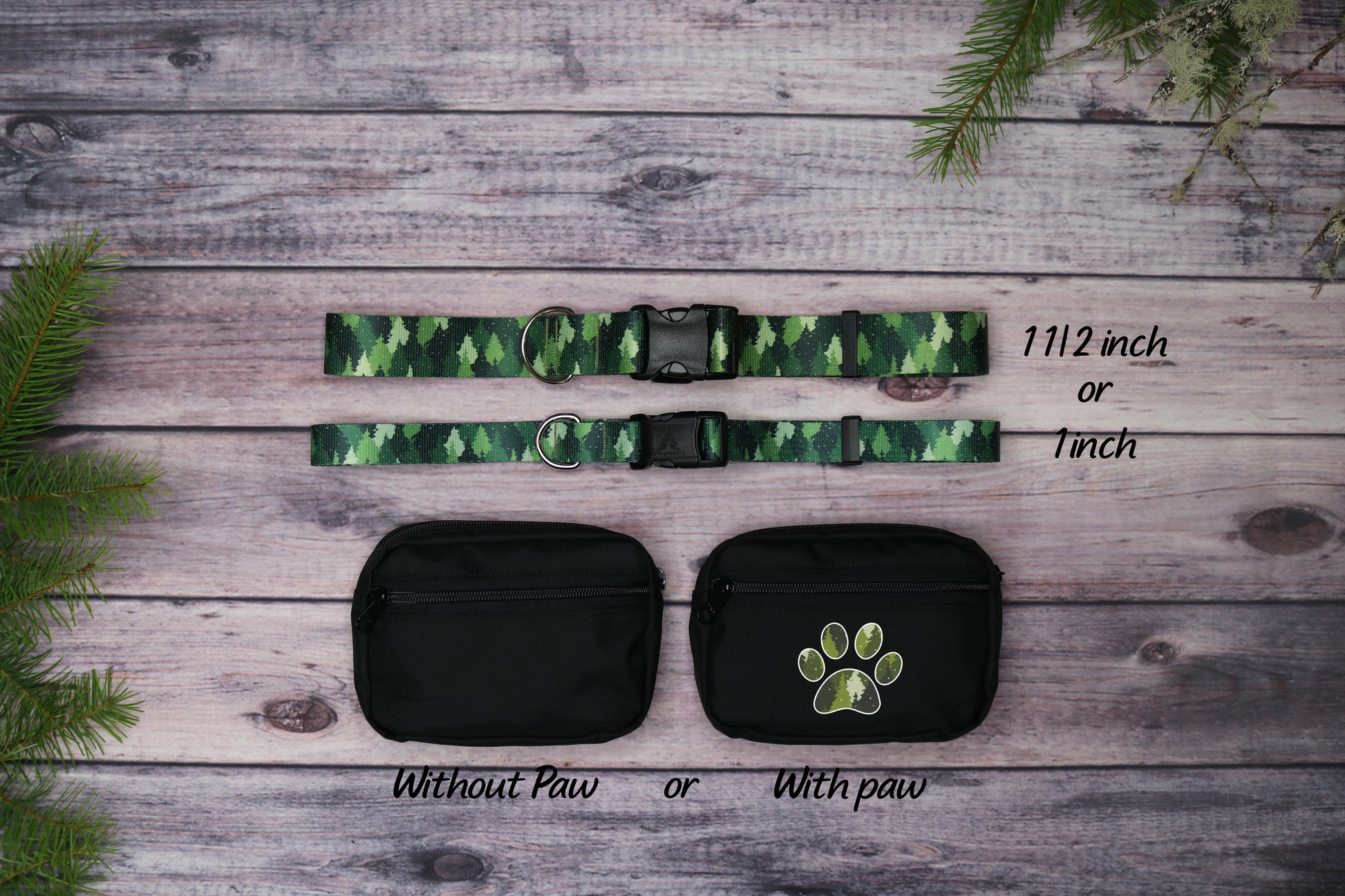 Keep all your and your dog's essentials organized with the Green Camo Trees Fanny Pack. Featuring a roomy main compartment for your items and a front pouch ideal for dog treats, this pack also includes a discreet bag dispenser on the back with an internal zipper pocket that holds two rolls, ensuring you're always prepared. Measuring 5" x 7", it is crafted from 50% recycled, durable materials. Choose between a 1.5-inch or 1-inch strap for a comfortable fit, with the 1.5-inch recommended for larger dogs and the 1-inch for smaller breeds. Each pack comes with a carabiner clip for the option to go handsfree and an optional free paw decoration.