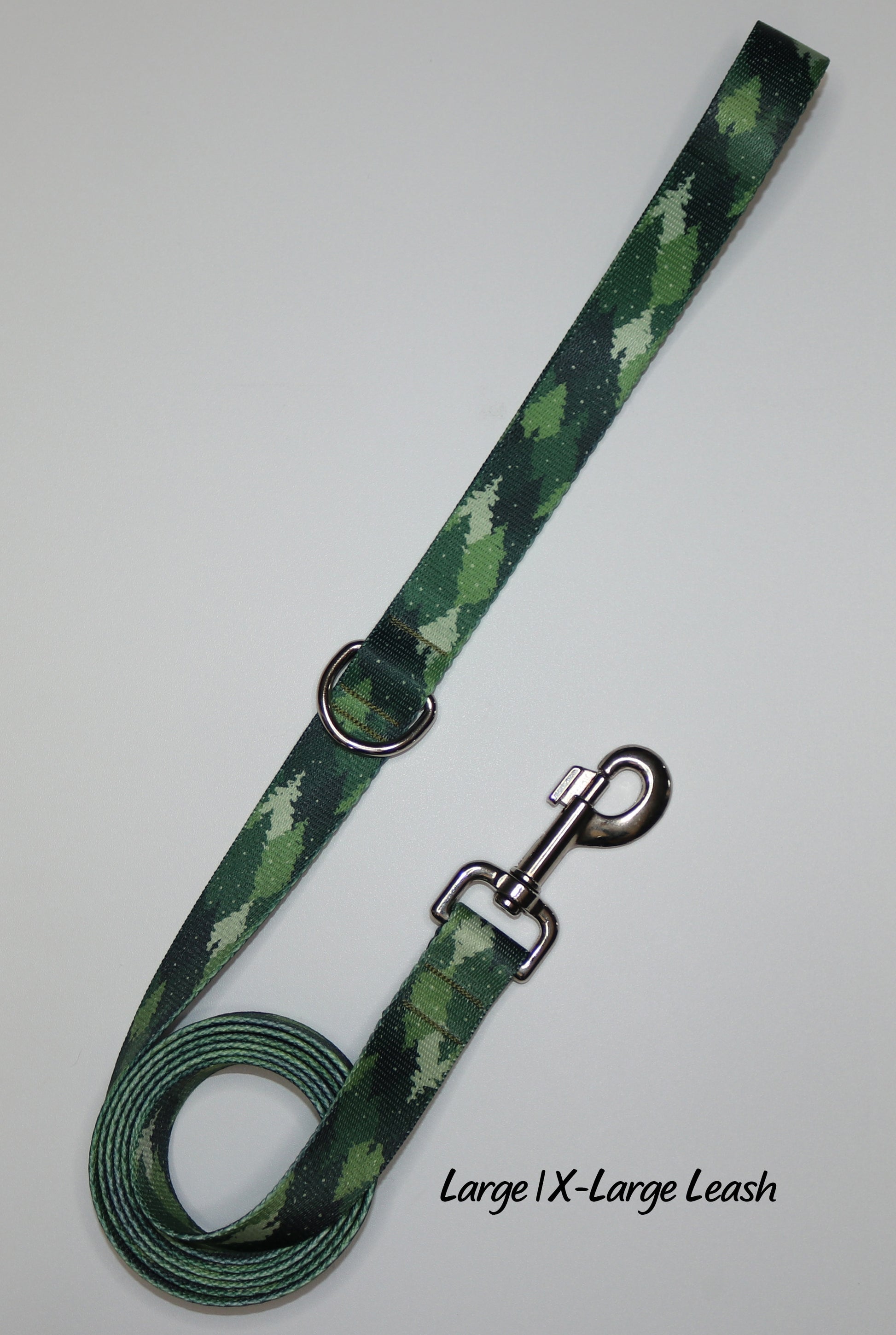 Crafted from materials designed for mountain climbing our leash offers exceptional strength and durability. The Green Camo Trees Leash comes in 4 sizes from X-Small to Large/X-Large. Each leash is standard 6 feet long. Made from 100% polyester, it is fully machine washable and maintains its vibrant colors without fading. This leash combines expert-level toughness with easy maintenance, ensuring reliable performance on every walk.