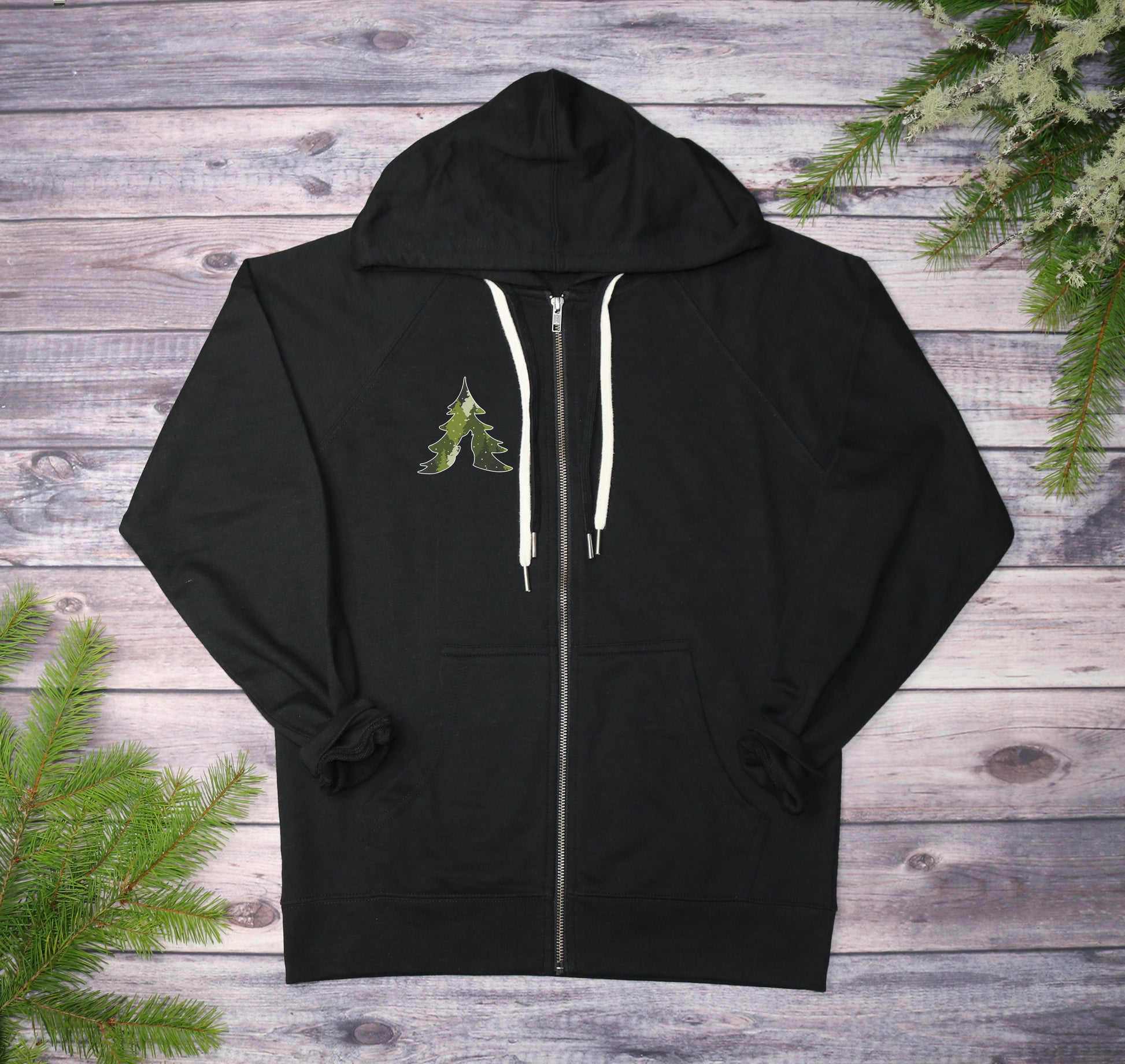 The Green Camo Trees Lightweight Terry Zip-Up Hoodie offers a distinctive blend of style and comfort, crafted from premium lightweight loopback terry fabric for year-round wear. Featuring raglan sleeves and 1x1 ribbing at cuffs and waistband, it ensures a tailored fit with ease of movement. Unique double shoelace drawcords with antique silver tips, antique silver zipper and zipper pull add an exclusive detail, setting it apart in the market. Designed with a unisex fit and available in two color choices, this hoodie combines expert craftsmanship with versatile appeal. This Hoodie runs slightly large, size down for a snug fit.