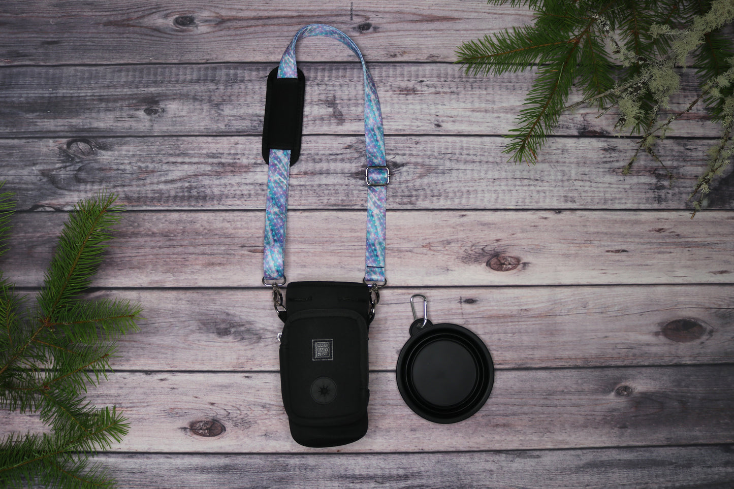 This Pastel Storm premium crossbody water bottle holder is crafted with durable triple stitching and all-metal hardware for lasting use. Choose from two sizes: Small will hold up to 32oz water bottles and Large will hold up to 40oz water bottle containers. Both sizes have a shoulder strap that can adjust up to 55". It features a built-in dog poop waste bag dispenser, and the small size contains enough space to hold keys and a debit card simultaneously while the Large size can contain larger cell phones as well. Comfortable to carry over the shoulder, it’s ideal for walks, hikes, or any dog adventure. The included collapsible pet bowl adds convenience on the go. A practical and thoughtful gift for pet owners, this accessory combines functionality with expert design (bottle not included).