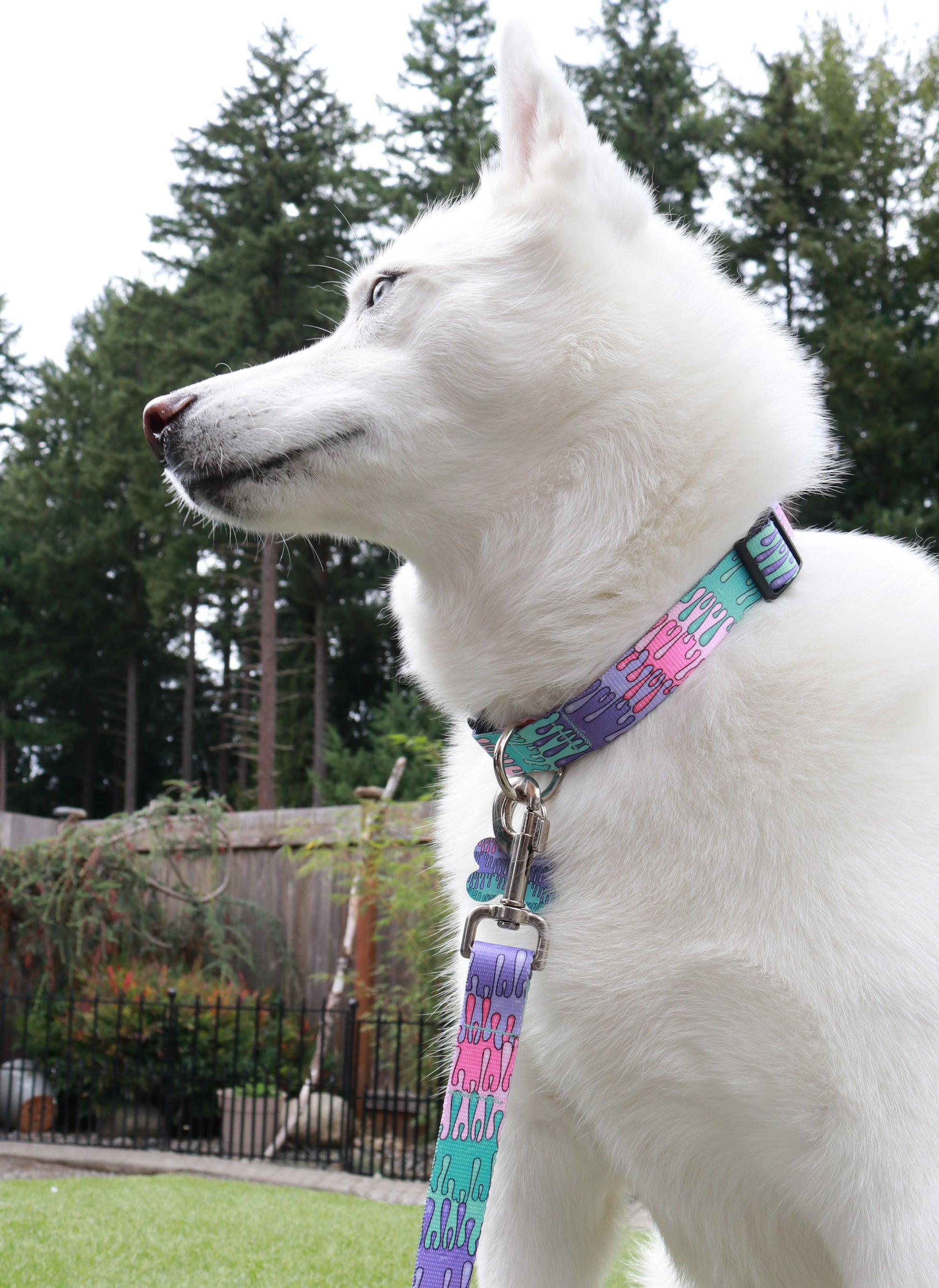 Crafted from materials designed for mountain climbing, our collars offer exceptional strength and durability. The Playful Drips Collars come in sizes from X-Small to X-Large, see the sizing chart for your dog's recommended collar size. Made from 100% polyester, it is fully machine washable and maintains its vibrant colors without fading. This collar combines expert-level toughness with easy maintenance, ensuring reliable daily use.