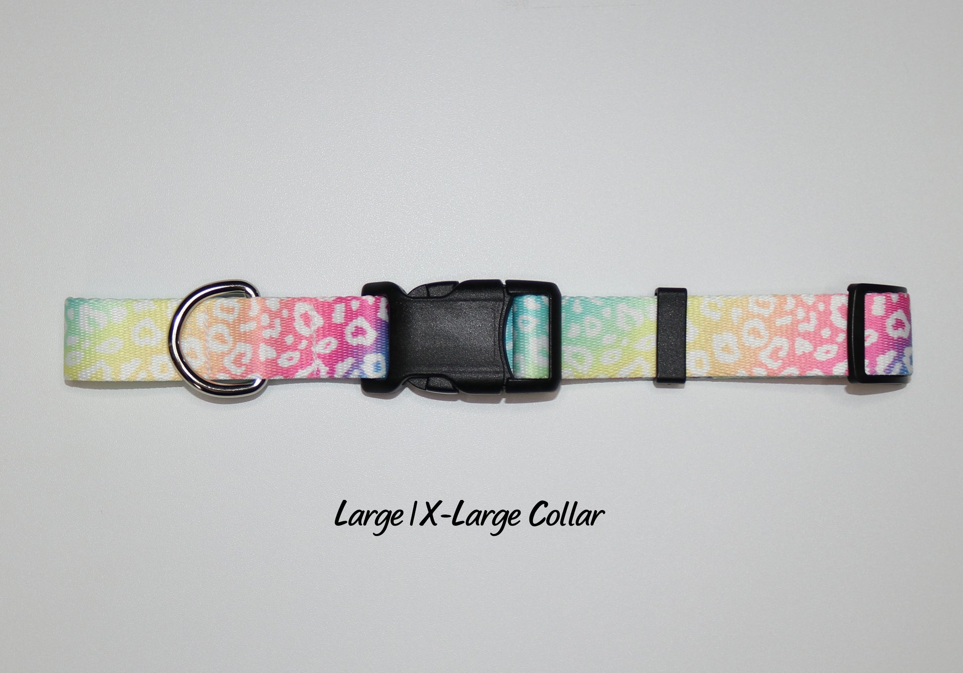 Crafted from materials designed for mountain climbing, our collars offer exceptional strength and durability. The Rainbow Leopard Collars come in sizes from X-Small to X-Large, see the sizing chart for your dog's recommended collar size. Made from 100% polyester, it is fully machine washable and maintains its vibrant colors without fading. This collar combines expert-level toughness with easy maintenance, ensuring reliable daily use.