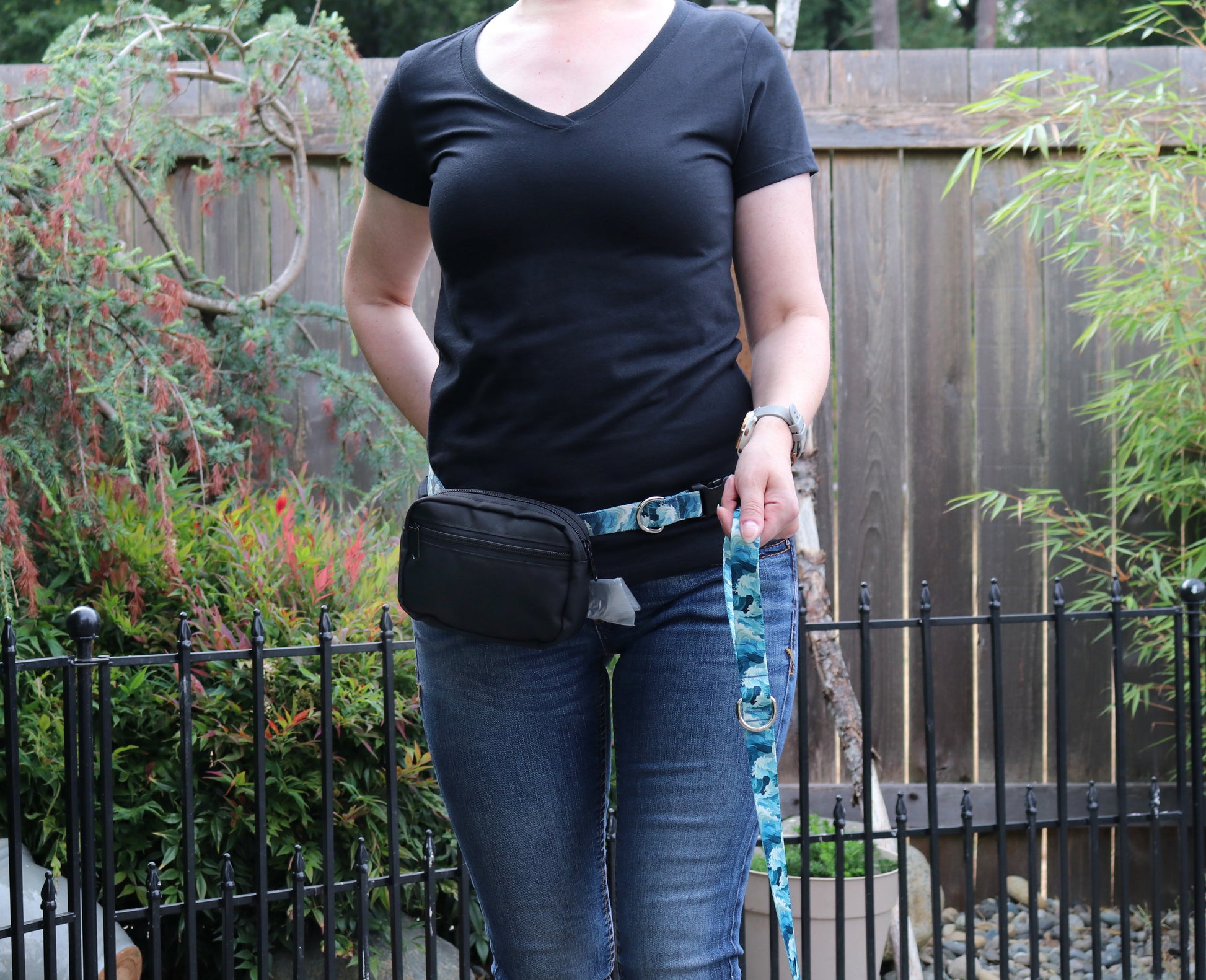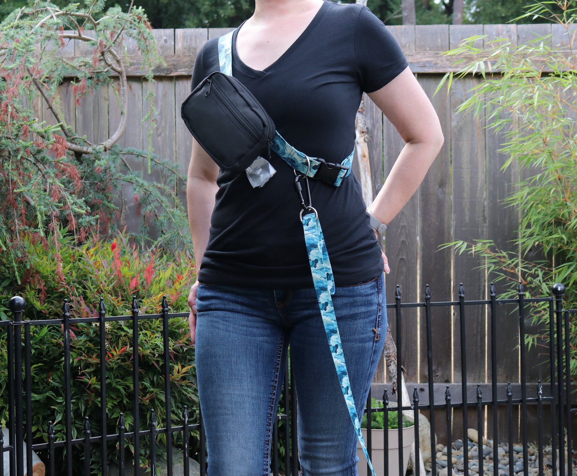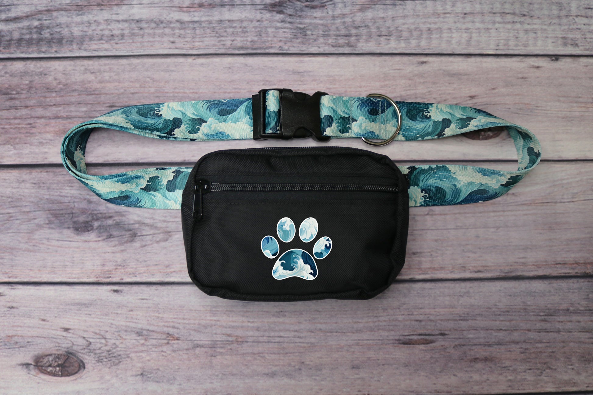 Keep all your and your dog's essentials organized with the Sublime Waves Fanny Pack. Featuring a roomy main compartment for your items and a front pouch ideal for dog treats, this pack also includes a discreet bag dispenser on the back with an internal zipper pocket that holds two rolls, ensuring you're always prepared. Measuring 5" x 7", it is crafted from 50% recycled, durable materials. Choose between a 1.5-inch or 1-inch strap for a comfortable fit, with the 1.5-inch recommended for larger dogs and the 1-inch for smaller breeds. Each pack comes with a carabiner clip for the option to go handsfree and an optional free paw decoration.