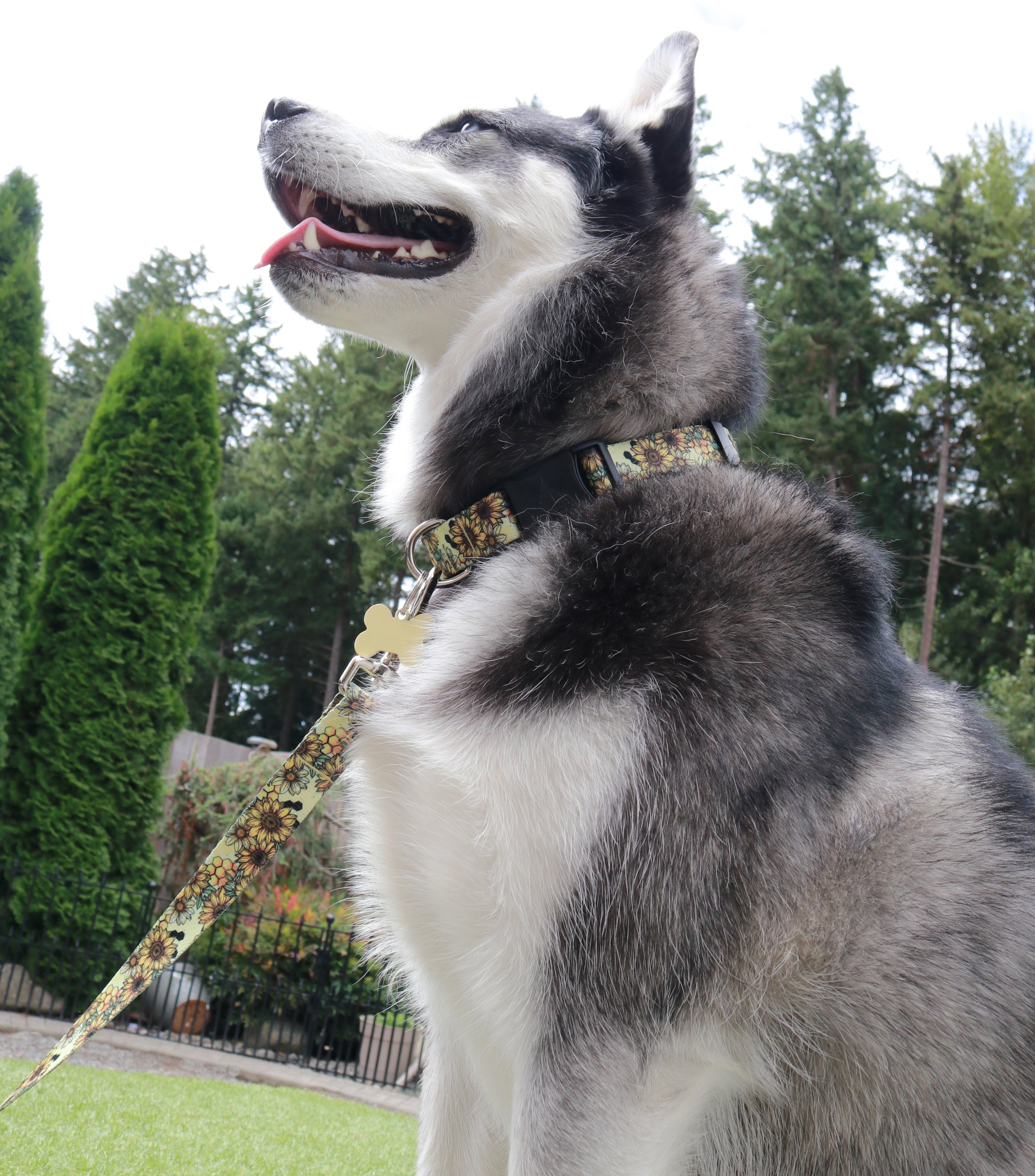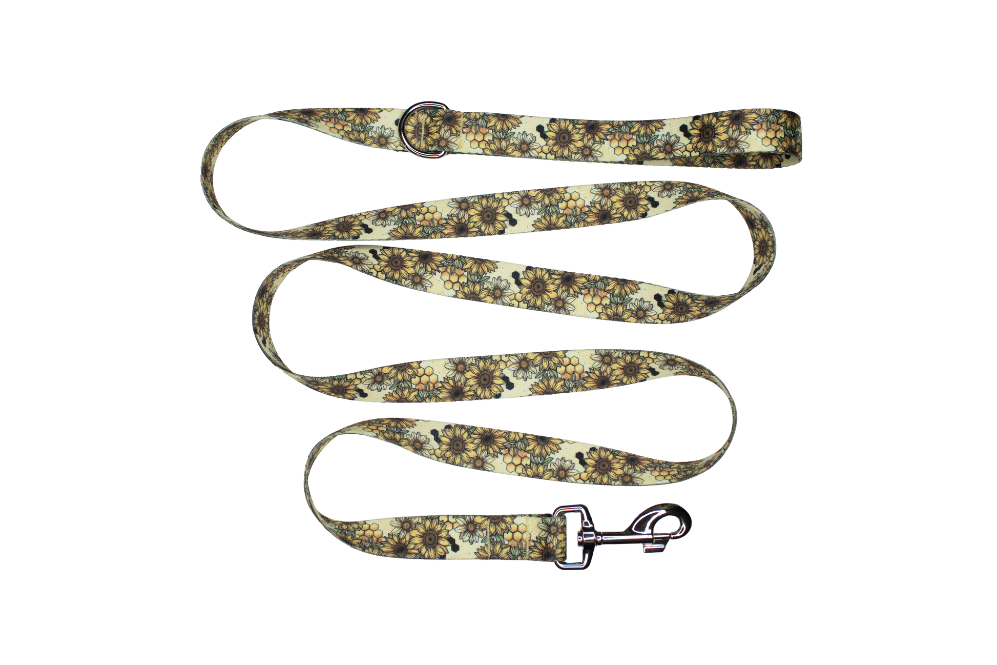 Crafted from materials designed for mountain climbing our leash offers exceptional strength and durability. The Sunflowers & Honey Leash comes in 4 sizes from X-Small to Large/X-Large. Each leash is standard 6 feet long. Made from 100% polyester, it is fully machine washable and maintains its vibrant colors without fading. This leash combines expert-level toughness with easy maintenance, ensuring reliable performance on every walk.