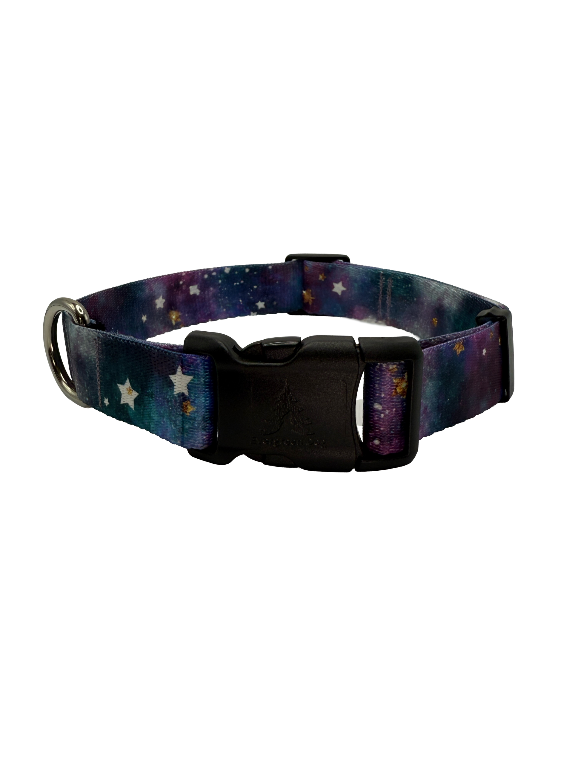 Crafted from materials designed for mountain climbing, our collars offer exceptional strength and durability. The Twilight Galaxy Collars come in sizes from X-Small to X-Large, see the sizing chart for your dog's recommended collar size. Made from 100% polyester, it is fully machine washable and maintains its vibrant colors without fading. This collar combines expert-level toughness with easy maintenance, ensuring reliable daily use.