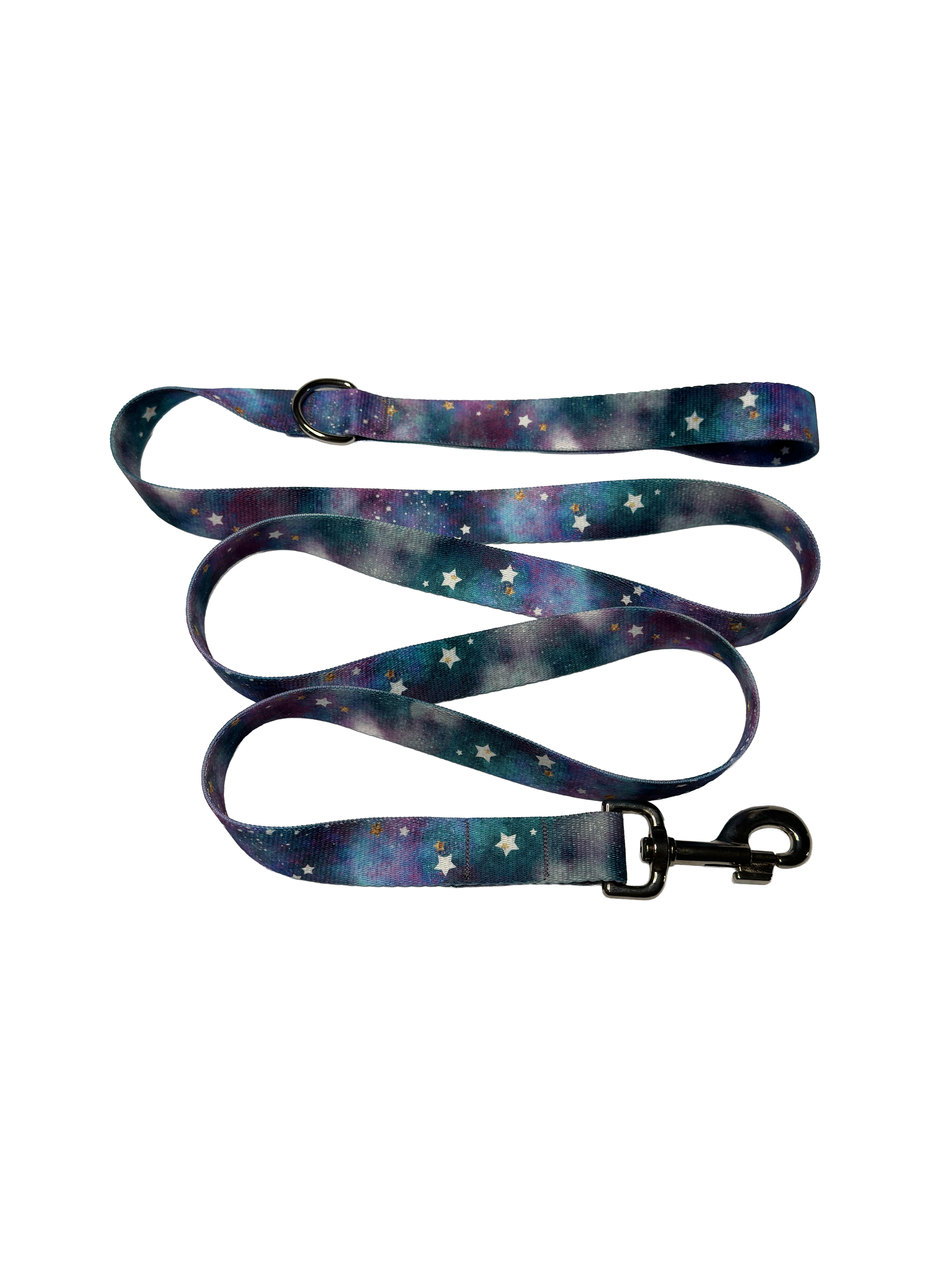 Crafted from materials designed for mountain climbing our leash offers exceptional strength and durability. The Twilight Galaxy Leash comes in 4 sizes from X-Small to Large/X-Large. Each leash is standard 6 feet long. Made from 100% polyester, it is fully machine washable and maintains its vibrant colors without fading. This leash combines expert-level toughness with easy maintenance, ensuring reliable performance on every walk.